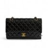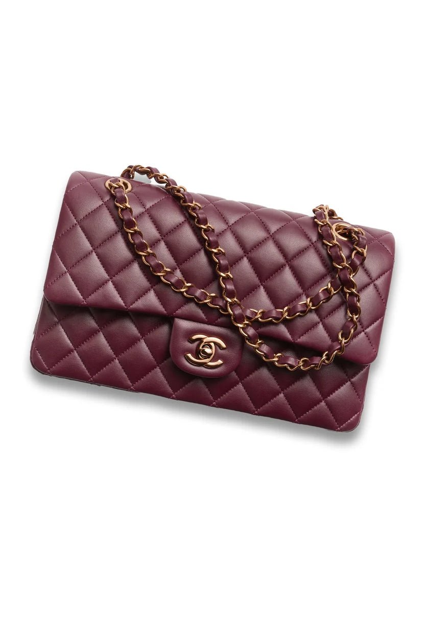 is a Chanel Classic Flap bag in mhroon quilted denim with gold-tone hardware