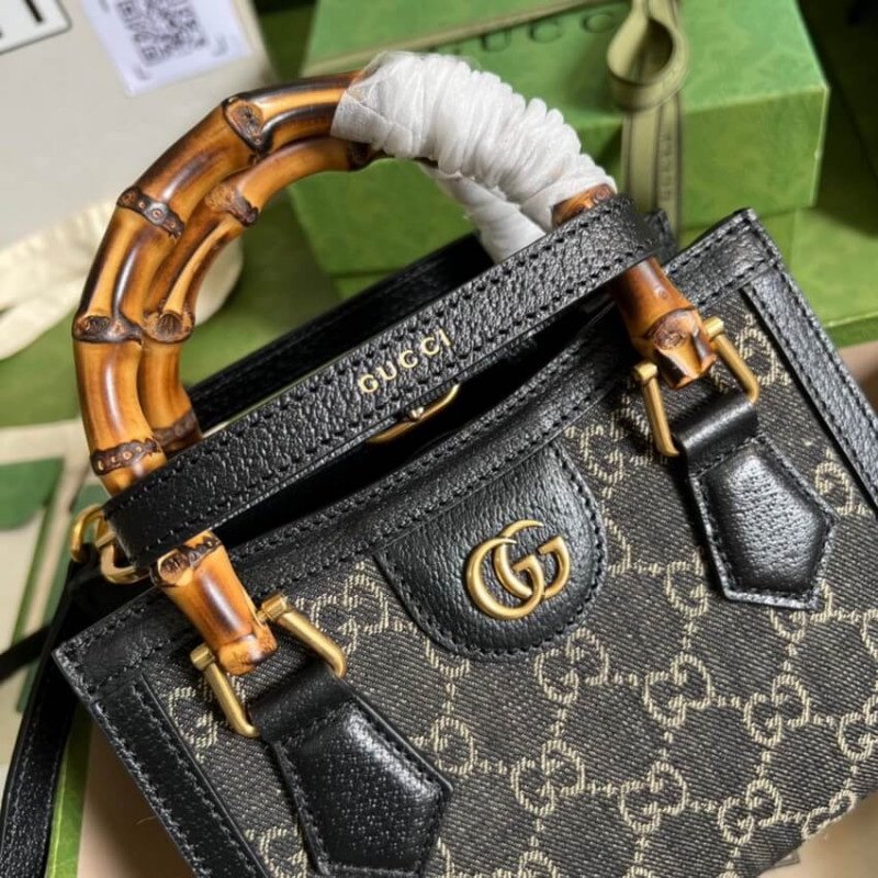 This is a Gucci Diana mini tote bag in a black and beige GG canvas with black leather trim and bamboo handles.