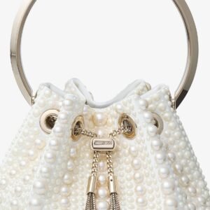 Jimmy Choo Bon Bon pearl-embellished satin bucket bag with a gold-tone metal bracelet handle.