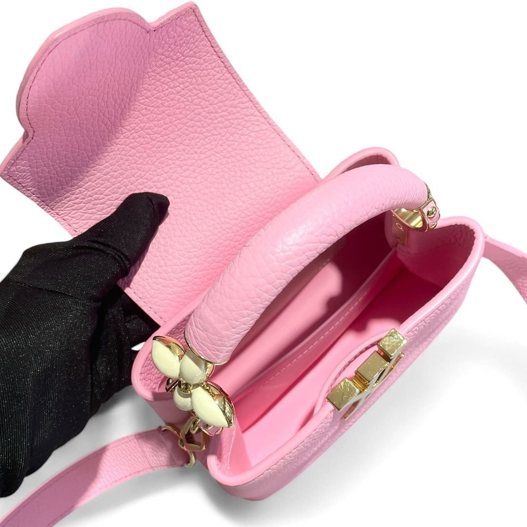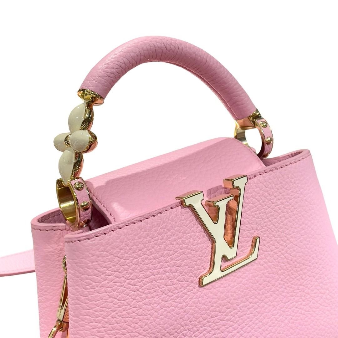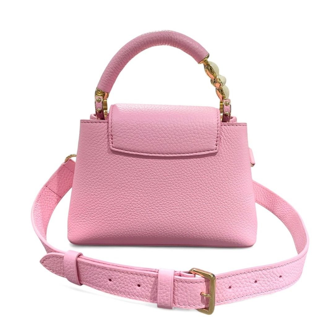 This adorable Capucines BB handbag is made from grained Taurillon leather and features a unique chain made of octagonal links. The links are decorated with jewel-like enamel, inlaid on the chain by hand. Exquisitely crafted, this compact bag can fit two large smartphones and a long wallet as well as other smaller essentials.