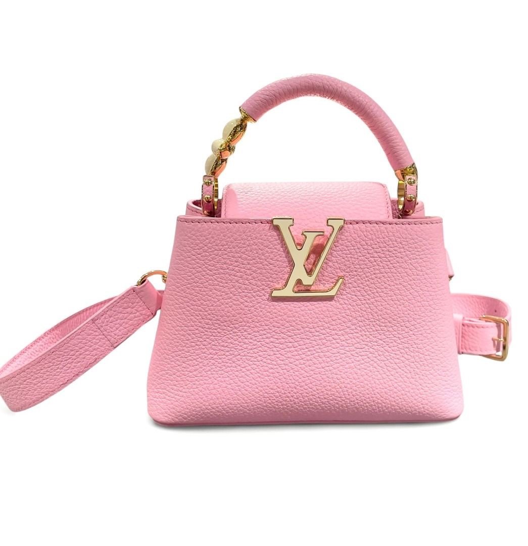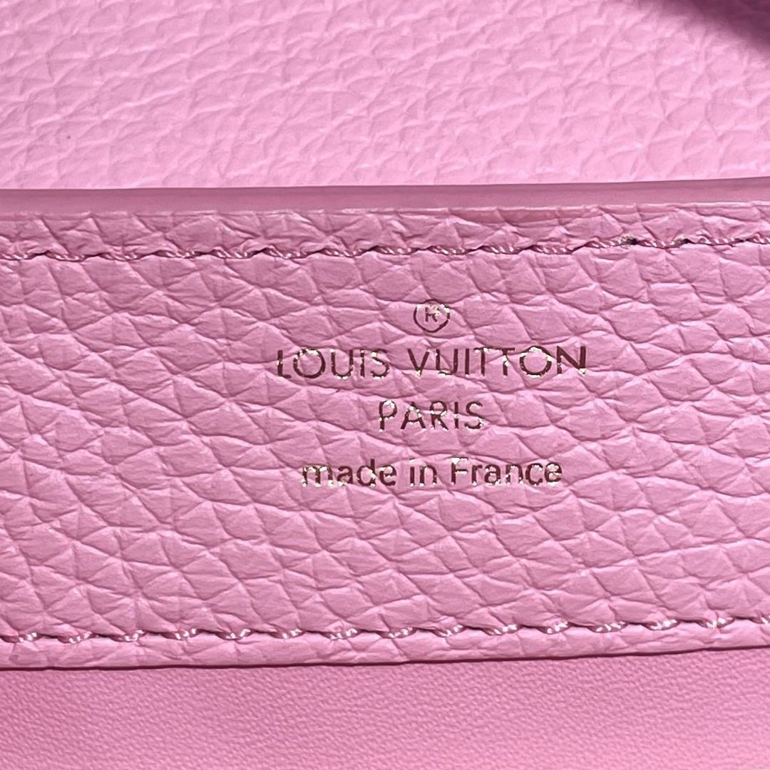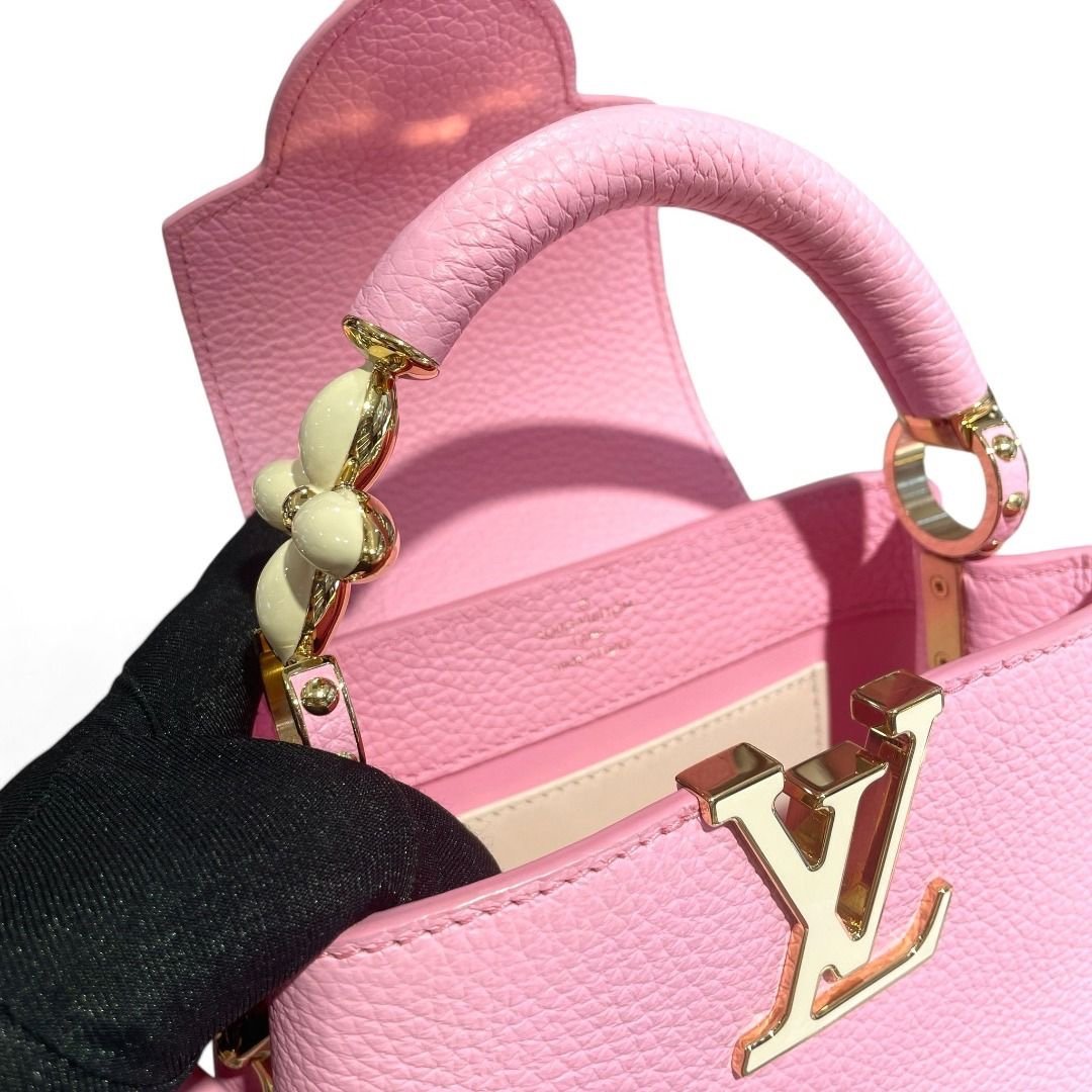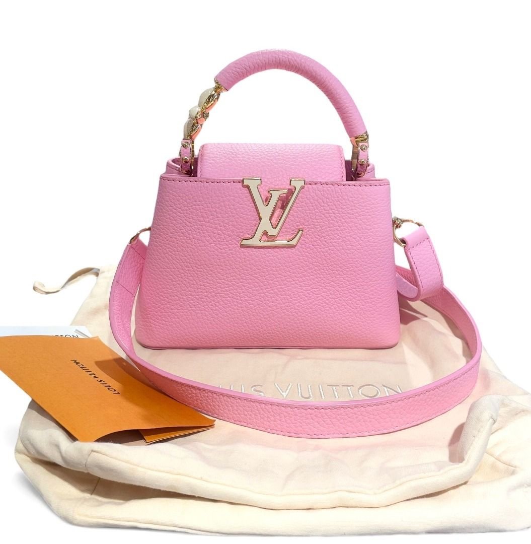 This adorable Capucines BB handbag is made from grained Taurillon leather and features a unique chain made of octagonal links. The links are decorated with jewel-like enamel, inlaid on the chain by hand. Exquisitely crafted, this compact bag can fit two large smartphones and a long wallet as well as other smaller essentials.